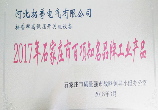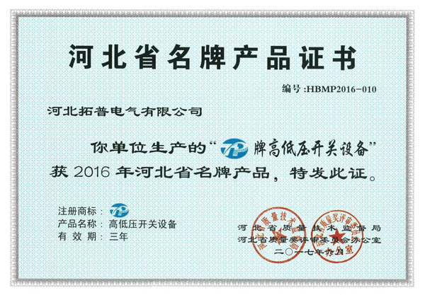 "TP牌高低壓開關設備”被評定為河北省名牌產品