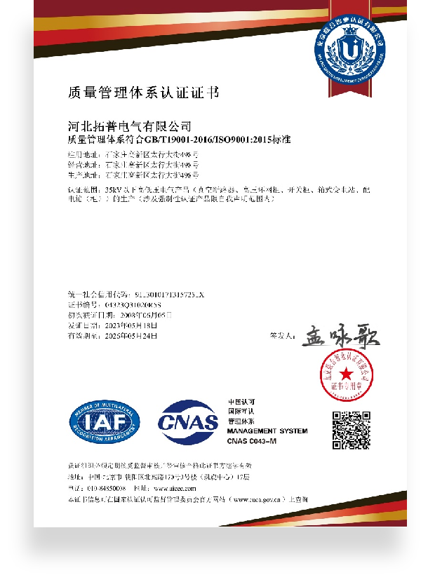 公司技術力量雄厚,檢測設備精良,項目經驗豐富,始終遵循“高起點、高科技、高質量”的戰(zhàn)略方針,堅持“顧客至上、優(yōu)質高效、不斷創(chuàng)新、持續(xù)改進”的質量方針,生產過程全面實施通過認證的ISO9000質量管理體系。經過多年技術研發(fā)及專家指導,生產工藝不斷完善,生產規(guī)模和銷售市場日益擴大,配備了裝配及自動化生產線的生產車間。公司主營業(yè)務:高低壓配電柜、真空斷路器、智能配電終端、絕緣子、電纜卡具、箱式變電器、電纜支架、重合器、負荷開關的生產、銷售。河北拓普電氣股份有限公司本著以質量求生存,以信譽創(chuàng)品牌的企業(yè)宗旨,努力超越,追求卓越,為客戶提供配電系統(tǒng)可靠的解決方案,竭誠歡迎廣大客戶參觀考察洽談業(yè)務,真誠合作,共同創(chuàng)造燦爛輝煌的明天。